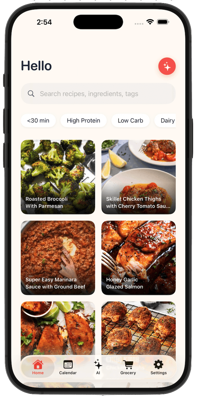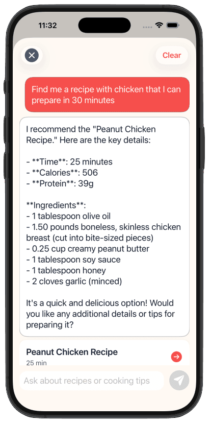 Chat with the AI to search your recipe collection or add items to your shopping list. Just speak or type into the chat.