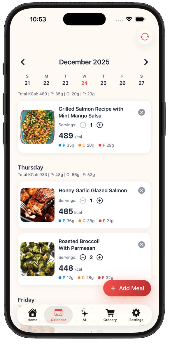 Conveniently add recipes to the calendar, create your grocery lists to prep for the week and see the daily macros.